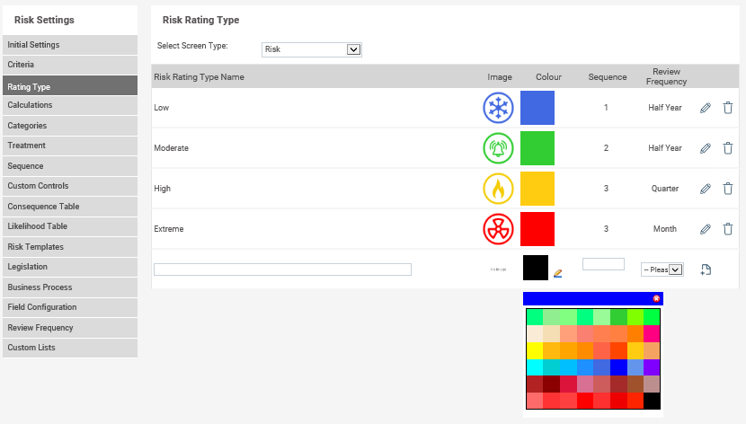 For each of the Risk Rating types, you may select the colour you wish to display in the graph.